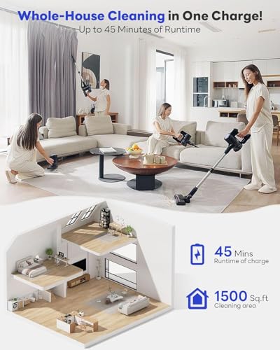 Specification: Cordless Vacuum Cleaner, 45KPA Stick Vacuum Cleaners for Home with Up to 45 Mins Runtime, 6-in-1 Rechargeable Lightweight Vacuum with Powerful Suction for Carpets, Pet Hair, Hardwood Floors