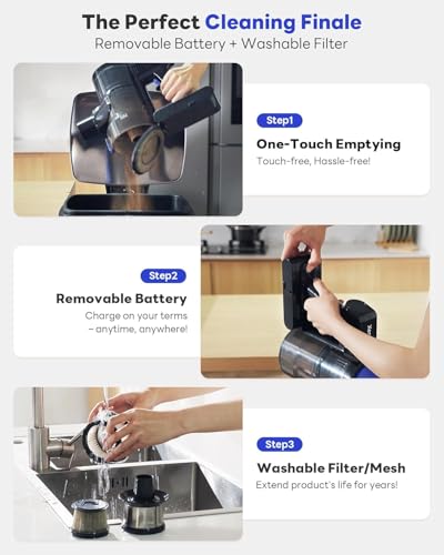 One-Touch Emptying, No More Mess – Hate dust clouds when emptying? The 0.18 gal (0.7L) large-capacity dustbin features one-touch ejection, completing cleanup in 3 seconds without getting your hands dirty. The washable HEPA filter effectively prevents odors, reducing maintenance costs by 80% to keep your vacuum fresh!