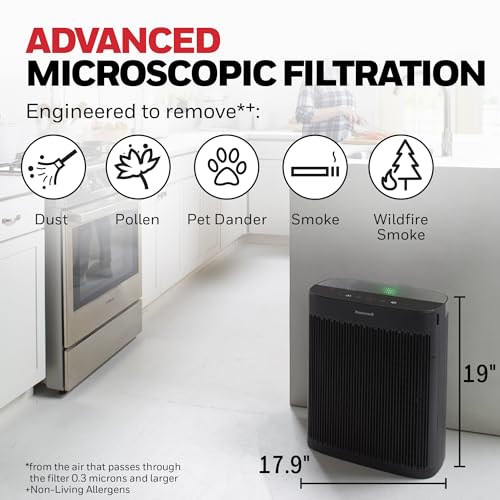 The Honeywell Allergen Plus Series HEPA Air Purifier is used to reduce allergens and provide cleaner, fresher air in large rooms up to 1,700 sq. ft.** HEPA filtration captures up to 99.97% of microscopic particles like dust, pollen, pet dander, dust-mite debris, and smoke*. The activated carbon pre-filter helps capture large airborne particles and reduces odors. If you have pets or stale indoor air, this model has an Air Quality Sensor that continuously monitors and adjusts air quality automatically. It also features InSight Display, which shows the 4 cleaning levels, air quality indicator, and Auto Mode setting. This quiet air purifier has an auto-off timer and dimmer option for control panel lights. Initial air purifier filters included: 2 HEPA R Filters, 1 Odor Reducing Pre-Filter A. Disclaimers: *From the air that passes through the filter, 0.3 microns and larger. **Based on 3rd party independent CADR testing for the smoke CADR value when operated at the highest level. Air circulation depends on many factors, such as room size and configuration. There is no guarantee that all of the air in a room will pass through the filter. The ENERGY STAR name and mark are registered trademarks owned by the U.S. EPA