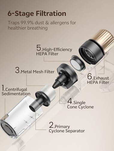 【GreenEye Technology & HEPA Filtration】See every speck of dust you would normally miss! Our high-performance green light exposes hidden dust on dark carpets, sofas, and under beds. Combined with a 6-stage HEPA filtration that traps 99.9% of dust and pollen, this powerful suction cordless vacuum ensures a truly deep clean.